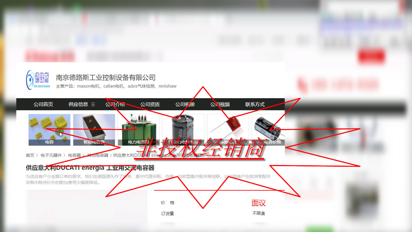 近年来由于我们产品市场占有率和品牌知名度的提高,招致一些公司的刻意混肴行为。例如我们在互联网和商务活动中发现,南京德路斯工业控制设备有限公司在互联网上以“供应意大利DUCATI energia 工业用交流电容”为题发布一些与意大利督凯提能源股份公司(DUCATI energia S.p.A)相同的产品型号信息,或商务活动中出文件,使读者误认为其与意大利督凯提能源股份公司(DUCATI energia S.p.A)或中国总代理商北京博度科技发展有限公司有某种疑似关联。实际上,没有任何关联。
