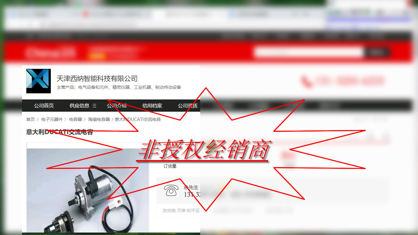 近年来由于我们产品市场占有率和品牌知名度的提高,招致一些公司的刻意混肴行为。例如我们在互联网和商务活动中发现,天津西纳智能科技有限公司在互联网上以“意大利DUCATI交流电容器”为题发布一些与意大利督凯提能源股份公司(DUCATI energia S.p.A)相同的产品型号信息,或商务活动中出文件,使读者误认为其与意大利督凯提能源股份公司(DUCATI energia S.p.A)或中国总代理商北京博度科技发展有限公司有某种疑似关联。实际上,没有任何关联。