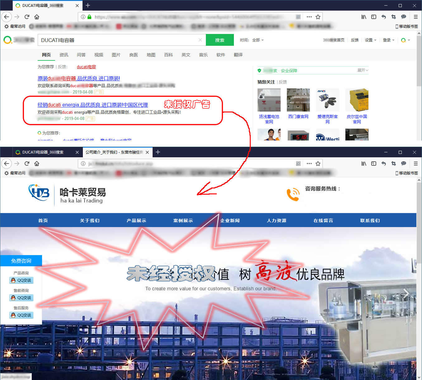 (哈卡莱贸易)东营市骏佳商贸有限公司在互联网建立和宣传“哈卡莱贸易(域名是2018年07月24日注册)”网站中在某搜索引擎上以“广告”推广的形式(见附图)发布DUCATI energia 产品广告,并宣称是“中国区代理”。其实,该公司与DUCATI energia S.p.A. 意大利督凯提公司没有任何代理授权。